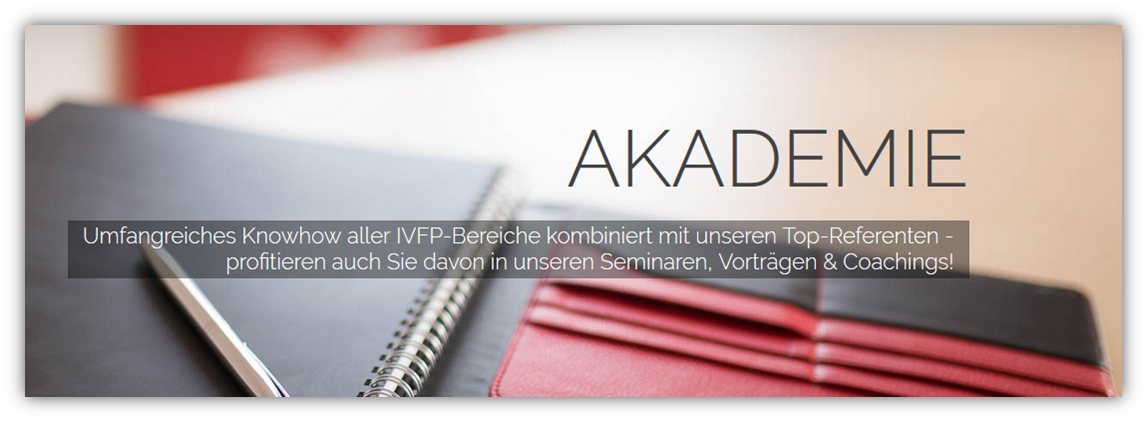 "Erfolg durch Wissen & Weiterbildung"... so lautet das Motto der IVFP-Akademie. Das IVFP steht seit über 17 Jahren für Kompetenz und Qualität! Dies schlägt sich auch in den fachlich hochwertigen und praxisnahen Seminaren, sowie