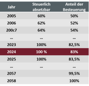Waren Beiträge in die Basisrente im Jahr 2005 nur zu 60 % als Sonderausgabe steuerlich absetzbar, sind es im Jahr 2024 bereits 100 %. Und dies für Beiträge bis zu einem Höchstbetrag (steigt jährlich) von aktuell 27.566 Euro (Verheiratete: 55.132 Euro).
