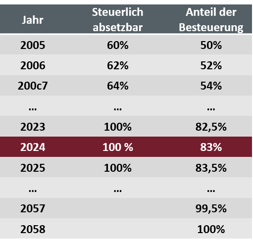 Damit liegt der abzugsfähige Prozentsatz bei 100 %. Beginnt im Jahr 2029 die Rentenauszahlung, so liegt der steuerpflichtige Anteil der Rente hingegen nur bei 85,5 %. Damit ergibt sich ein „Steuerplus“ von +14,5 %.