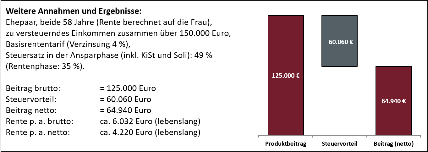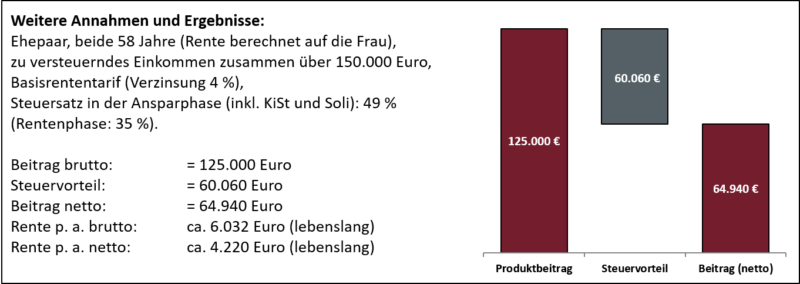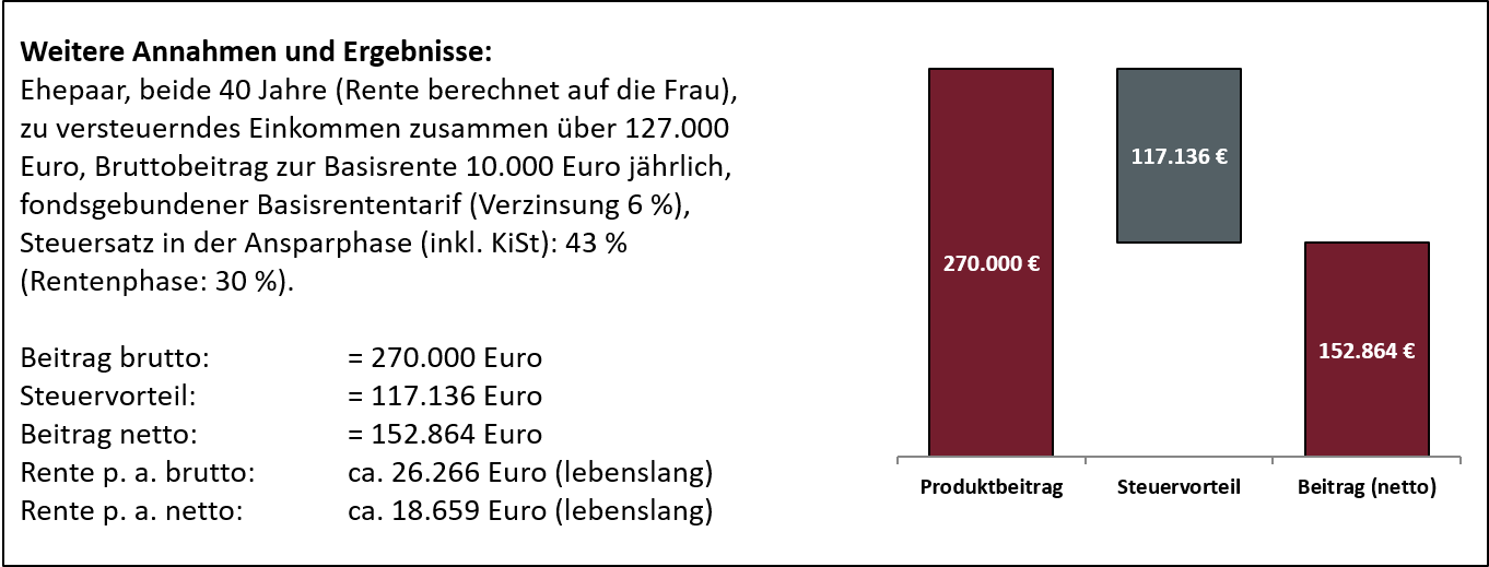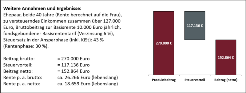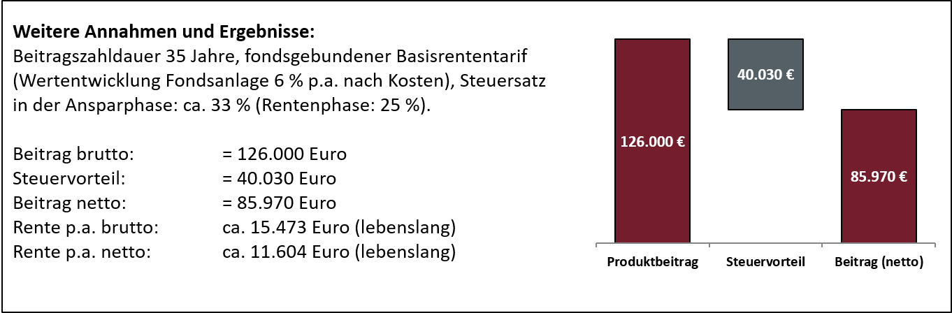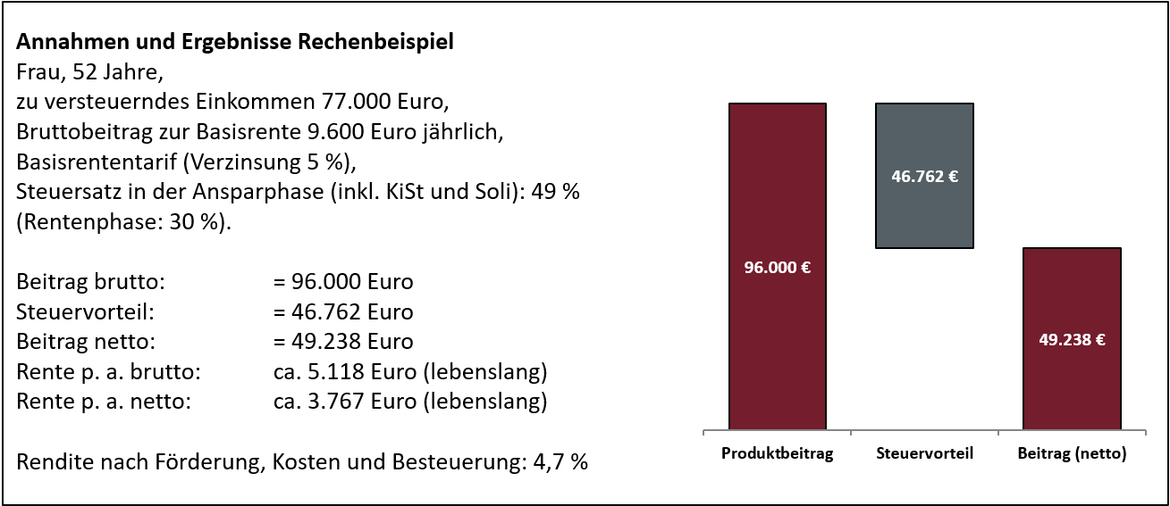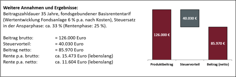 Spart etwa eine 32-jährige Frau (verheiratet) mit einem gemeinsamen zu versteuernden Einkommen von 70.000 Euro regelmäßig 300 Euro monatlich bis zum Rentenbeginn in einer fondsgebundenen Basisrente an, so kann er mit einer Rendite von ca. 4,2 % nach Förderung, Kosten und Besteuerung rechnen. Ein alternatives Investmentprodukt müsste 5,8 % p.a. vor Abgeltungsteuer erzielen, um die gleiche Rendite nach Abzug der Abgeltungsteuer zu erwirtschaften.