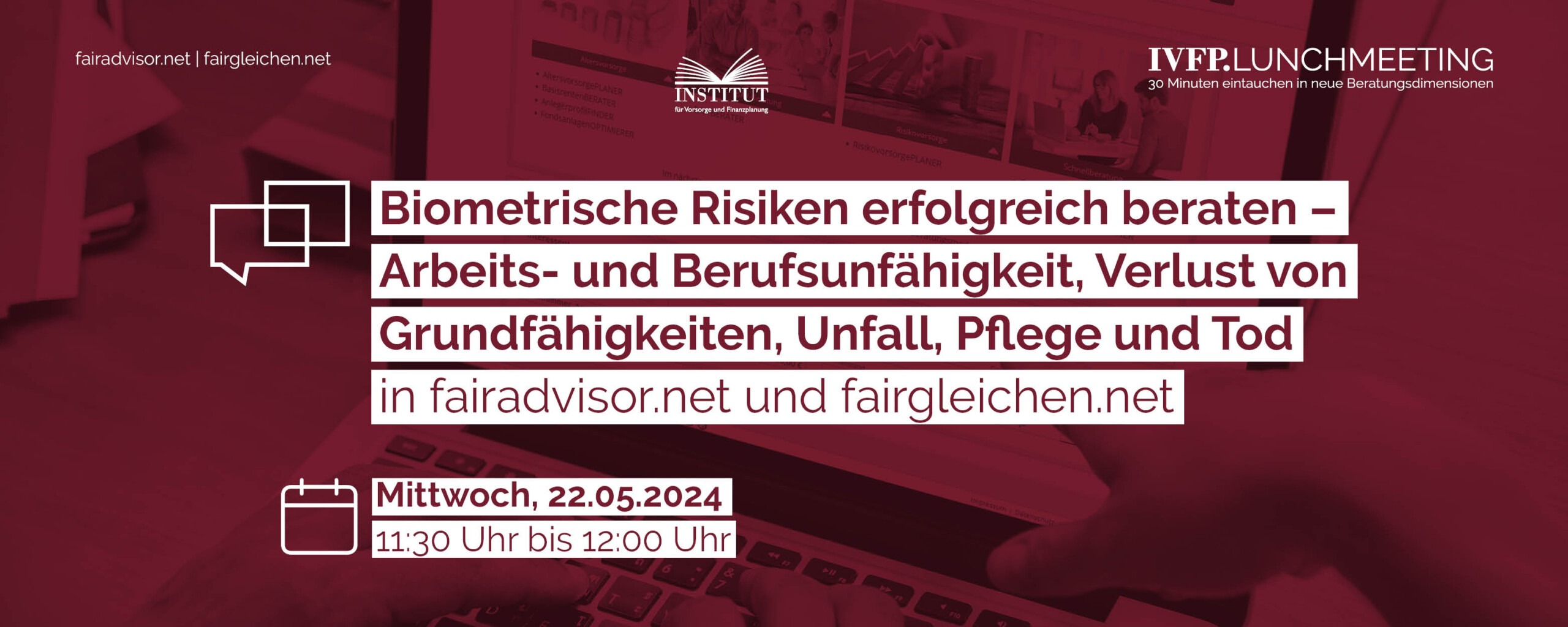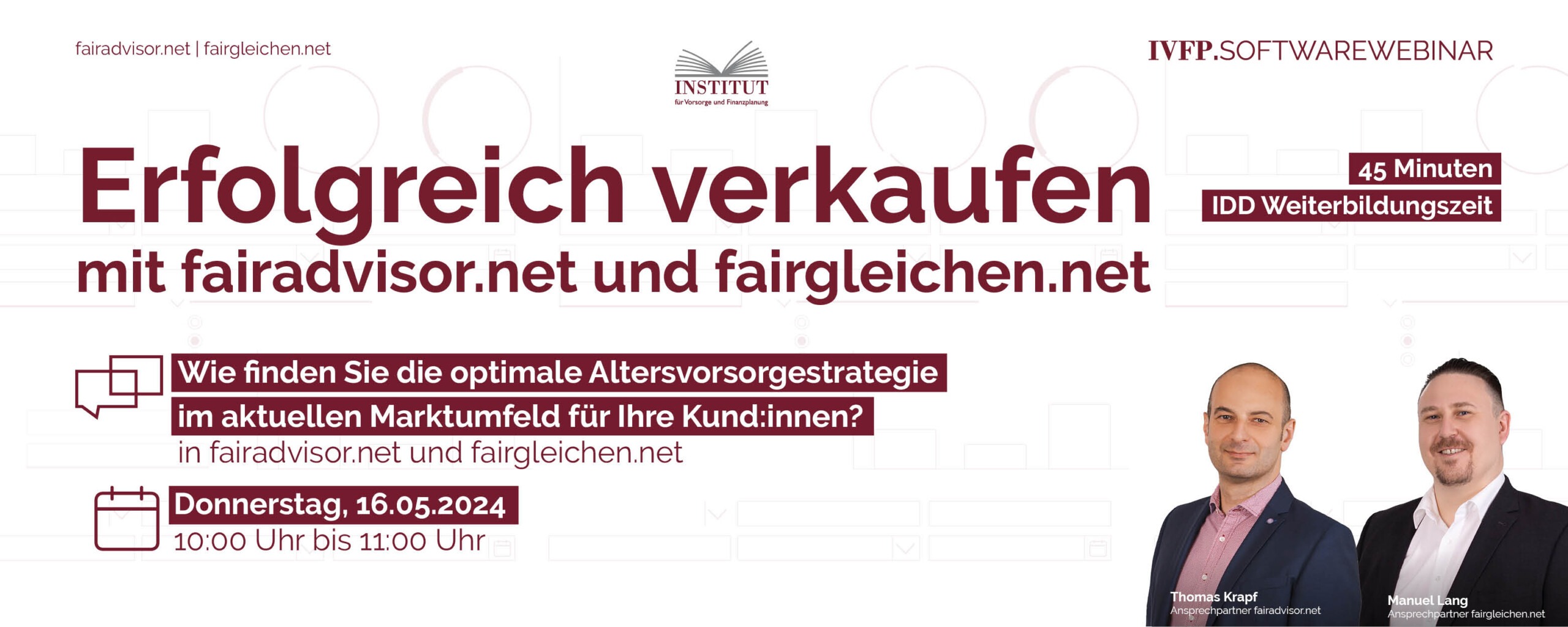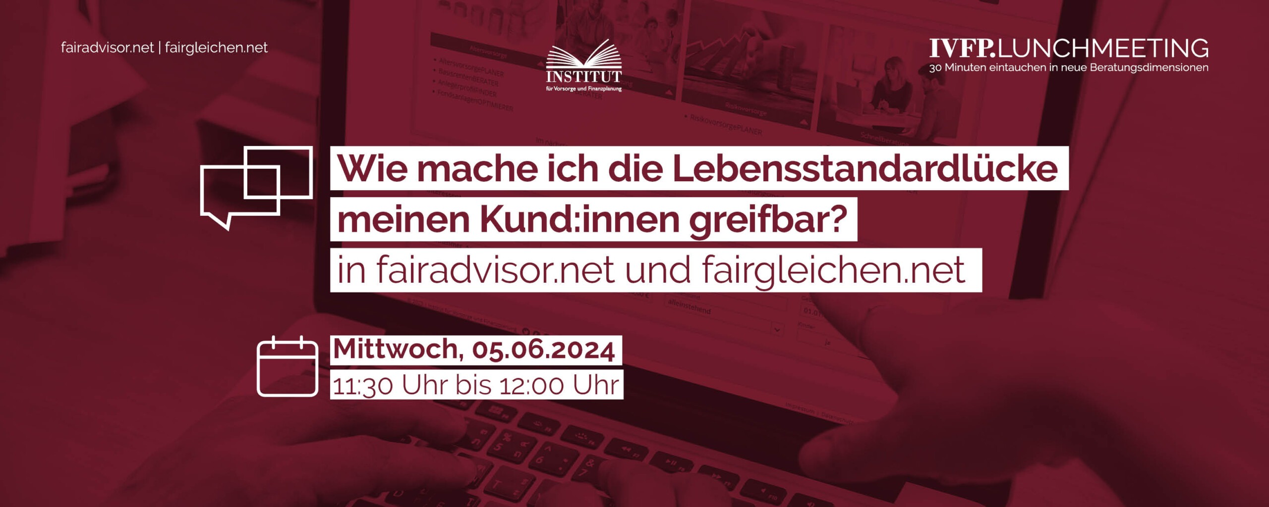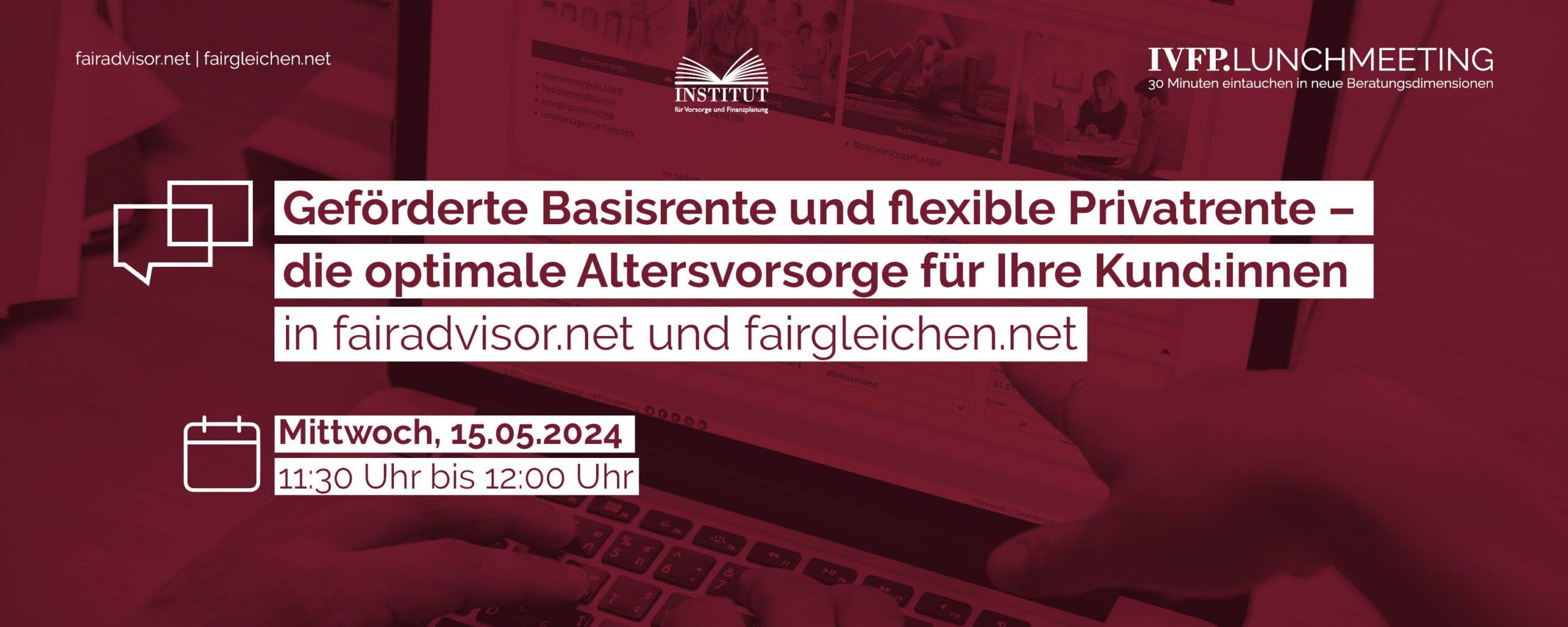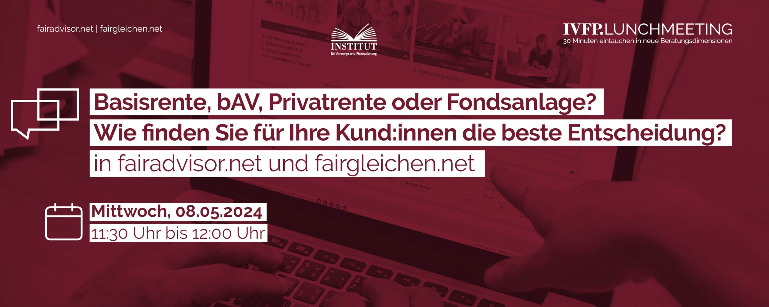 Tauchen Sie mit dem digitalen IVFP.Lunchmeeting und digitalen IVFP.Softwarewebinar in die neuen IVFP Beratungsdimensionen von fairadvisor.net und fairgleichen.net ein. IVFP Experten zeigen Ihnen in regelmäßigen, kostenlosen Webinaren, wie Sie Ihre Beratung zur Altersvorsorge optimieren können. Die Beratungssoftware fairadvisor.net und Tarifvergleichssoftware fairgleichen.net bieten Ihnen die Möglichkeit, eine auf die Bedürfnisses Ihrer Kund:innen abgestimmte Altersvorsorge zu finden. Gewinnen Sie jetzt einen Einblick mit unseren Online-Events.
