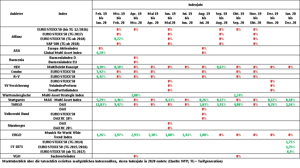 Trotz des sehr guten Börsenjahres 2019 bedeutete der Crash im Februar/März 2020 – hervorgerufen durch die Corona-Krise – für viele Kunden, dass sie im Jahr 2020 auf Renditegutschriften verzichten mussten. Auch die sehr rasche Erholung des Aktienmarktes im Laufe des Jahres konnte daran nichts mehr ändern. Insbesondere Anbieter, deren Indexmodell auf dem Cap-Verfahren basiert, konnten dem Kunden keine Gutschriften aus der Indexpartizipation weitergeben. Wesentlich hierfür war der Börsencrash zu Jahresbeginn, welcher für stark negative Renditen in den Monaten Februar und März 2020 sorgte. Da diese nicht nach unten beschränkt sind, gingen sie in voller Stärke in die Ermittlung der Indexrendite ein. Die folgenden zum Teil sehr guten Monate wurden jedoch durch den Cap beschränkt, was eine positive Jahresrendite fast unmöglich machte. Auch die sehr volatilen (stark schwankenden) Aktienmärkte trugen dazu bei, dass positive Renditen bei Indexpolicen mit Cap letztendlich unmöglich wurden. Aber auch Indexmodelle, die mit einer Partizipationsquote arbeiten, waren kaum in der Lage, positive Renditen zu erzielen. Auch wenn bei diesen Modellen die Schwankungsintensität der Kapitalmärkte nur eine geringere Rolle spielt, war der Absturz der Börsen zu stark, um diesen wieder vollständig aufzuholen. Letztendlich waren nur Indexmodelle mit einer Partizipationsquote in der Lage, für gewisse Indexstichtage, die nach dem Crash endeten, positive Indexrenditen zu erzielen. Einen Marktüberblick über die Indexrenditen (2020) finden Sie in folgender Grafik.