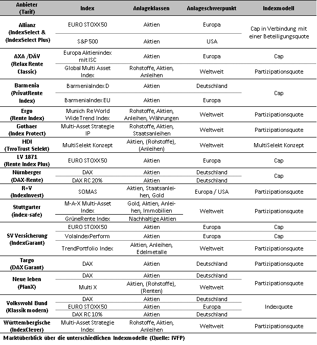 Indexgebundene Rentenversicherungen (Indexpolicen) sind inzwischen aus der Produktlandschaft deutscher Lebensversicherer nicht mehr wegzudenken. Sie stellen aktuell eine sehr beliebte Produktgattung dar, wie auch eine aktuelle Umfrage des Instituts für Vorsorge und Finanzplanung (IVFP) bestätigt: Etwa 70 Prozent aller befragten Vermittler bieten Indexpolicen aktiv zum Kauf an. Jedoch macht das Niedrigzinsumfeld den Indexpolicen zu schaffen, denn die Überschussbeteiligung der Versicherer spielt nach wie vor die entscheidende Rolle für die Renditechancen dieser Produktgattung. So haben sich die Condor und die VGH entschieden, ihre Indexpolicen aus dem Angebotsportfolio zu entfernen. Auch die Generali (RenteIndex bAV) wird nicht mehr aktiv angeboten. Außerdem hat die R+V ihren Indextarif überarbeitet. Neben einem neuen Index – der SOMAS Index (Solactive Multi Anlage Stabil Index) löst den Eurostoxx 50 ab – setzt die R+V-Police anstatt einer Renditeobergrenze (Cap) jetzt auf eine Beteiligungsquote und folgt somit dem Trend moderner Indexpolicen. Auch der Volkswohl Bund hat seine Indexpolice ergänzt: Der Kunde kann jetzt zwischen IndexZins und IndexChance wählen. Wählt er die Zins-Variante erhält der Kunde auch bei einer negativen Indexrendite eine Gutschrift in Höhe von einem Prozentpunkt. Dafür sind die Indexquoten und somit die Renditechancen geringer im Vergleich zur IndexChance. Aktuell können somit bei 16 Lebensversicherungsunternehmen Indexpolicen abgeschlossen werden. Einen aktuellen Überblick über die angebotenen Indexpolicen liefert folgende Grafik.