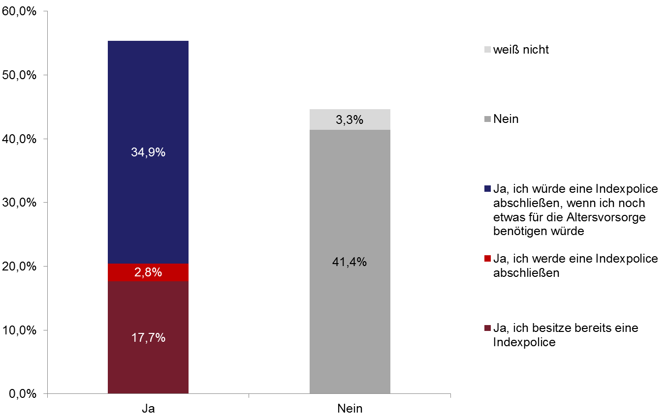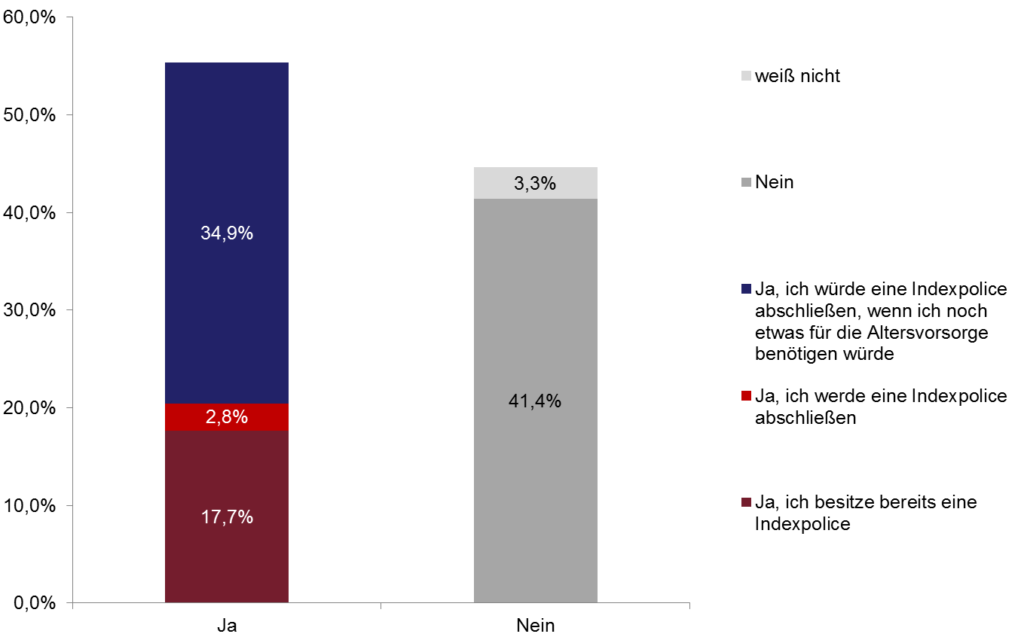 Die Abbildung zeigt die interessante Feststellung, dass über die Hälfte der Vermittler selbst eine Indexpolice abgeschlossen haben bzw. diese für einen Abschluss in Betracht ziehen würden, wenn Sie selbst noch etwas für die Altersvorsorge benötigen würden.
