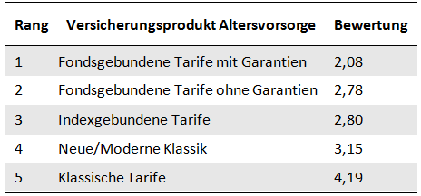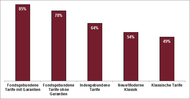 So gaben mehr als die Hälfte aller Makler an, dass sie keine klassischen Produkte mehr vermitteln. Der Trend geht klar in Richtung kapitalmarktorientierter Produkte. Etwa zwei Drittel aller Befragten gab an, indexgebundene Rentenversicherungen (Indexpolicen) zu verkaufen. Zu fondsgebundenen Tarifen wird am häufigsten beraten, wobei Garantien innerhalb dieser Produktgattung immer noch eine wesentliche Rolle spielen.
