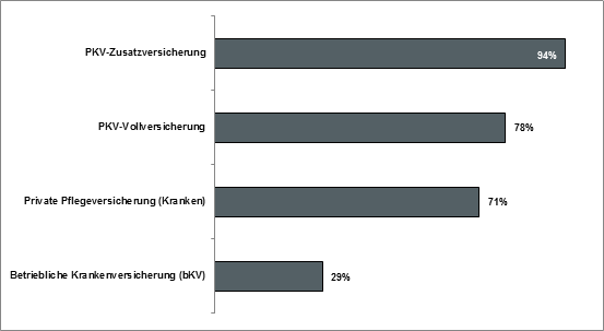 gaben mehr als 90 Prozent aller Berater an, dass Sie Zusatzversicherungen vermitteln. Dieser Versicherungszweig besitzt laut Umfrageergebnisse auch das höchste Absatzpotenzial gefolgt von der Pflegeversicherung und der PKV-Vollversicherung. Zur betrieblichen Krankenversicherung (bKV) hingegen wird nur von wenigen Maklern (29 %) beraten. Auch das Absatzpotenzial der bKV wird eher gering eingeschätzt.