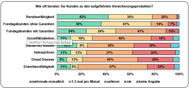 Rolle bei Berater:innen. Die Umfrageteilnehmer:innen beraten am häufigsten zu Berufsunfähigkeitsversicherungen. Die Grundfähigkeitsversicherung ist bei der Absicherung der Arbeitskraft auf Platz eins, wenn eine BU-Versicherung nicht möglich ist oder bspw. aus Kostengründen nicht in Frage kommt.