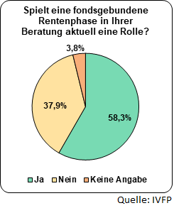 Wie die Grafik zeigt, gewinnt der kapitalmarktnahe Rentenbezug auch bei der Vermittlung an Bedeutung. Denn bei knapp 60% der Befragten spielt eine fondsgebundene Rentenphase in der Beratung eine Rolle. Einigkeit herrscht bei der Frage, ob Produkte mit fondsgebundenem Rentenbezug in Zukunft von höherer Bedeutung sein werden. Für ca. 92% der Teilnehmer:innen ist dies klar der Fall. „Gerade in Zeiten sehr niedriger Zinsen kann es für viele Versicherungsnehmer:innen durchaus Sinn machen, auch in der Rentenphase auf eine kapitalmarknahe Anlage des Vertragsguthabens zu setzen,“ so Michael Hauer, Geschäftsführer des IVFP.