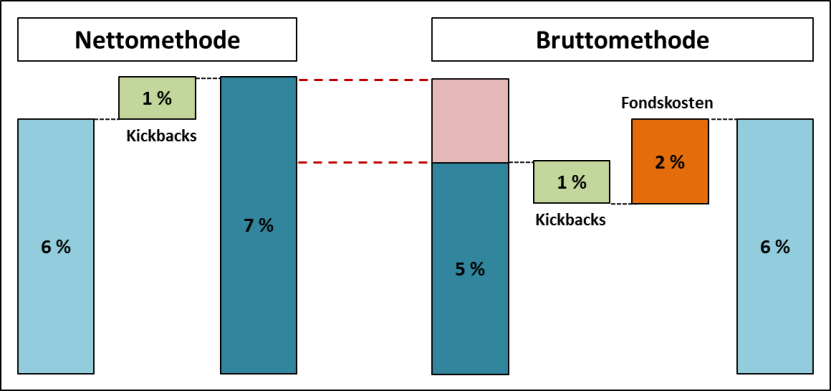 Je nachdem, wie diese Faktoren in der Beispielrechnung Berücksichtigung finden,spricht man von der Brutto- oder Nettomethode. Während bei der Nettomethode die Fondskosten keine Rolle spielen, werden diese bei der Bruttomethode in Abzug gebracht. Mögliche Kickbacks finden in beiden