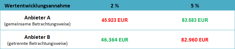Ein Vergleich von Ablaufleistungen oder Rentenhöhen, die auf unterschiedlichen Betrachtungsweisen basieren, ist folglich irreführend. So ist es bspw. nicht ungewöhnlich, dass Produkt A bei der Annahme einer Wertentwicklung von z. B. 5 % eine höhere Ablaufleistung aufweist als Produkt B. Wird jedoch eine Wertentwicklung von bspw. 2 % für die Beispielrechnung unterstellt, kann es vorkommen, dass Produkt B hinsichtlich der Ablaufleistung besser abschneidet. Vergleiche hierzu auch folgende Abbildung.